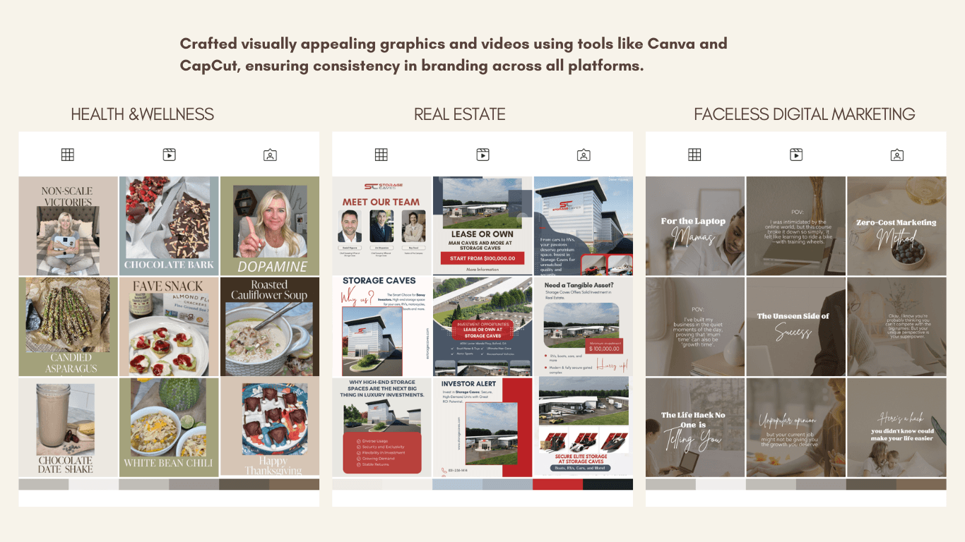 Content Creation:Designing and scheduling posts (graphics, videos, and text). Crafting engaging captions and calls-to-action.